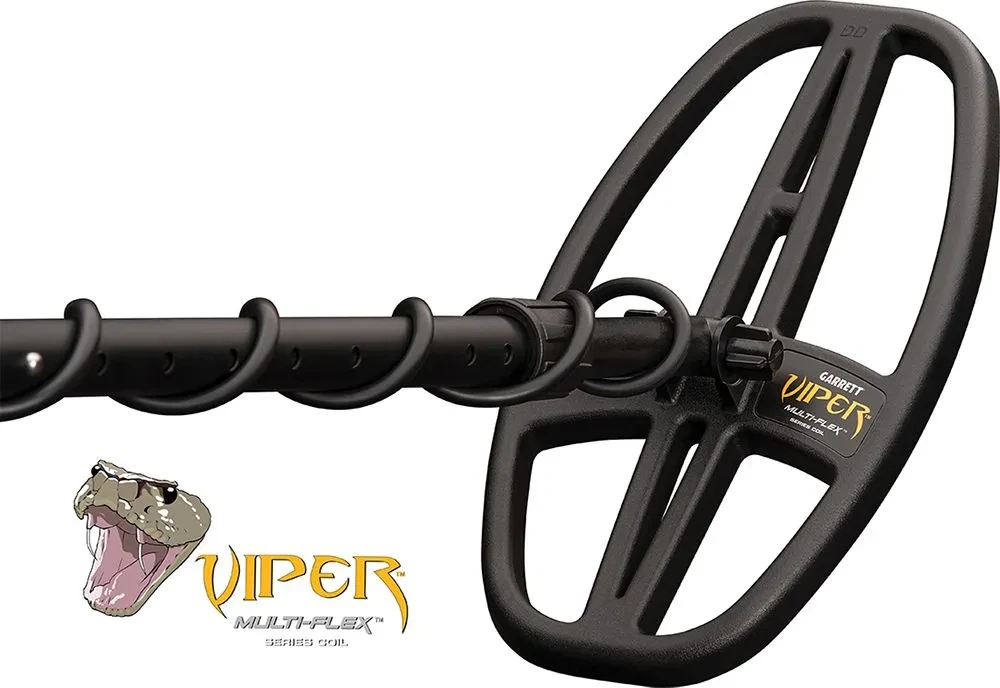 Die 15 x 28 cm DD Viper-Suchspule des Apex ermöglicht die Suche in verschiedenen Geländearten, darunter auch feuchte Gebiete, da sie komplett wasserdicht ist.