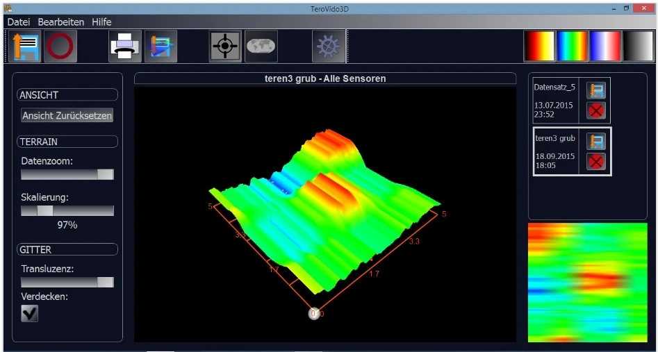 Dort werden die Daten mit Hilfe der Software TeroVido®3D in einer 3D und 2D Ansicht als mehrfarbiges Terrain visualisiert, um sie genauestens ntersuchen zu können.