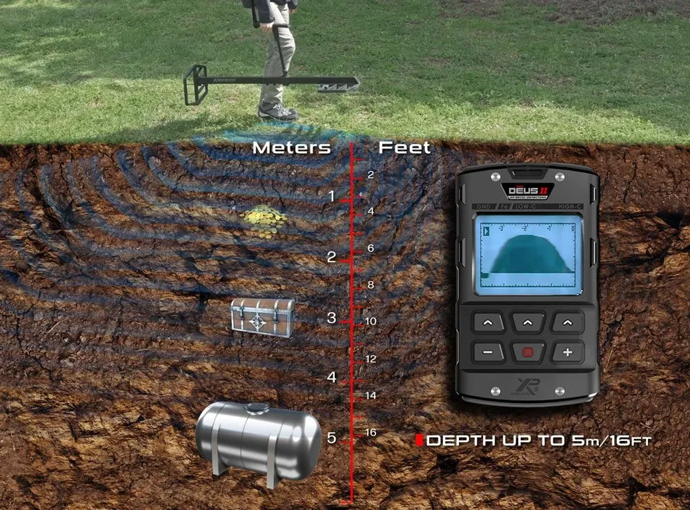 Die Fast Multi Frequency (FMF®)-Technologie gewährleistet eine unvergleichliche Leistung und minimiert Bodengeräusche. Sie ermöglicht das Erreichen extremer Tiefen von bis zu 5 Metern (16 Fuß) und die Entdeckung der tiefsten Ziele. Xtrem Hunter ist ideal für Archäologen zur Entdeckung großer Objekte, leidenschaftliche Sondengänger und Schatzsucher, Kampfmittelräumdienste und industrielle Anwendungen zur Ortung von tief liegenden Tanks, Leitungen, Schieberdeckeln usw. Entdecken Sie wie nie zuvor!