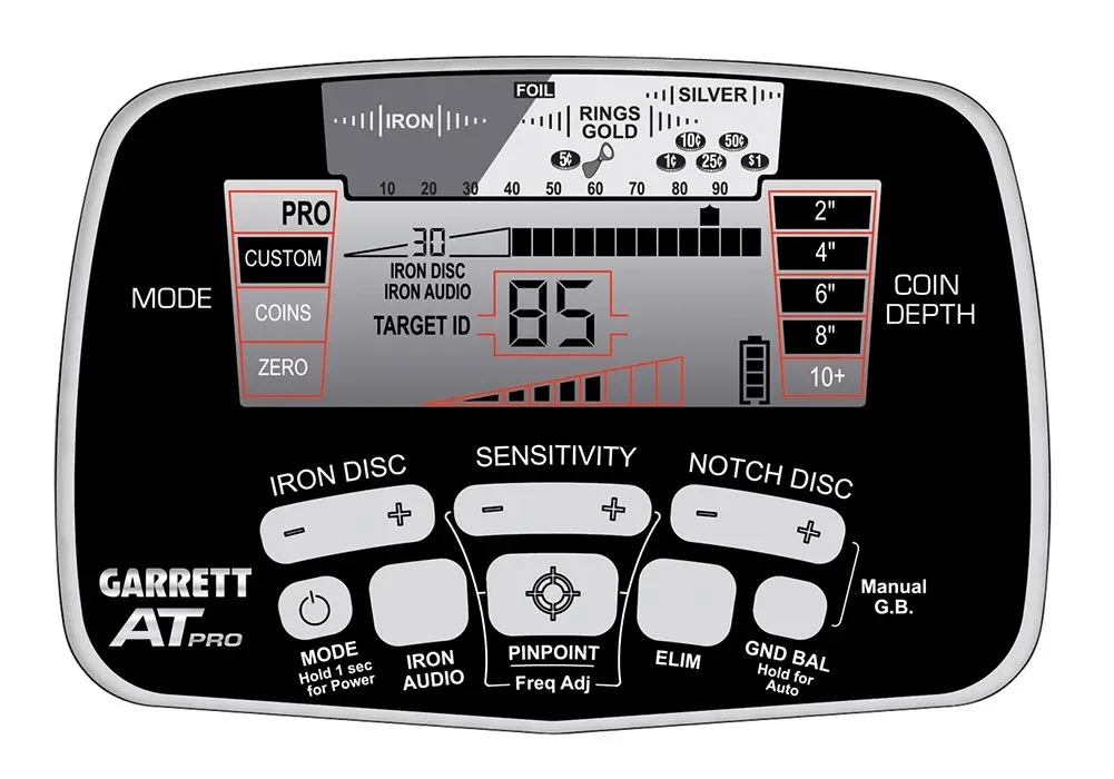 Der Garrett AT Pro International bietet auch eine umfangreiche Eisendiskriminierung mit 40 Segmenten sowie eine spezielle Eisenton-Funktion für erfahrene Anwender. Mit all diesen Funktionen ist dieser “All Terrain” Metalldetektor zweifellos eine Revolution in der Welt der Metalldetektoren.