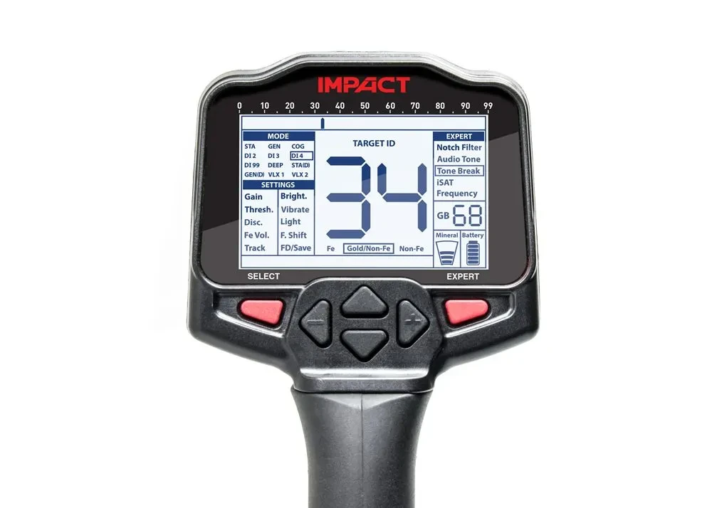 In Bezug auf Toneinstellungen ist der Impact äußerst vielseitig. Er bietet die Iron Break-Funktion, mit der Sie den Eisenton anpassen können. Sie können die Eisentöne erhöhen oder sogar ausschalten, um verschrottete Suchgebiete effizient zu durchsuchen. Mit der iSAT Threshold-Funktion können Sie einen konstanten Hintergrundton einstellen, um geringfügige Tonabweichungen hörbar zu machen, was die Entdeckung sehr kleiner Objekte verbessert. Unterschiedliche Töne können für die Identifizierung verschiedener Objekte und Metallarten genutzt werden, und mit der Tone-Break-Funktion können Sie individuelle Grenzwerte zwischen den verschiedenen Tönen festlegen.