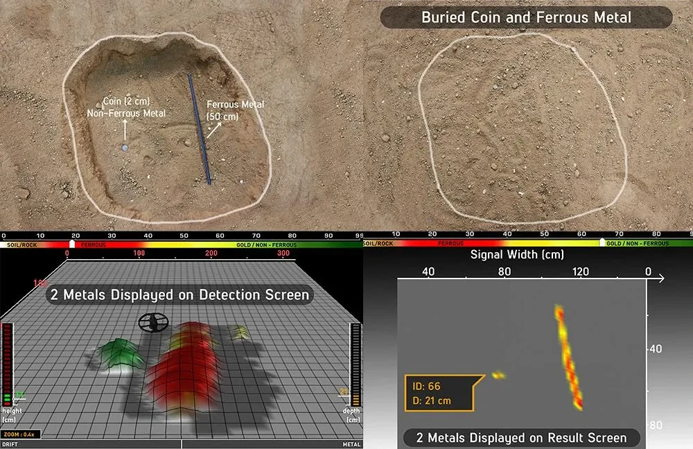 Der Nokta Invenio erstellt in Echtzeit eine 3D-Karte des Bodens bis zu mehreren Metern Tiefe. Dabei werden sämtliche Hohlräume und Metallobjekte identifiziert, um ein detailliertes Bild dessen zu erhalten, was sich unter der Erde befindet.