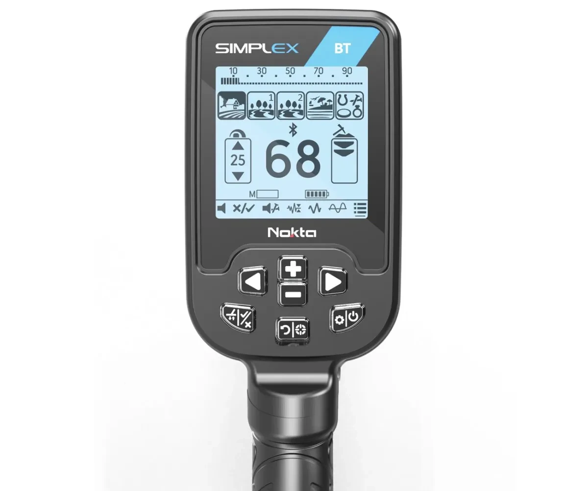 Der Nokta Simplex BT ähnelt dem Simplex+ Standard, wurde jedoch mit einer Reihe von Verbesserungen ausgestattet. Die Suchspule wurde optimiert, das untere Gestänge besteht aus Carbon, die Benutzeroberfläche wurde überarbeitet, es verfügt über ein integriertes Bluetooth-Modul und ist nun bis zu 5 Meter wasserdicht.