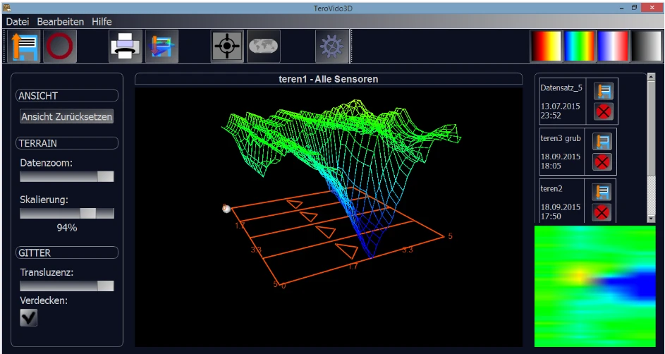 Dort werden die Daten mit Hilfe der Software TeroVido®3D in einer 3D und 2D Ansicht als mehrfarbiges Terrain visualisiert, um sie genauestens untersuchen zu können.